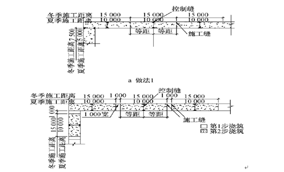 由于影響因素較多,理論上不好確定。目前,還沒有普遍能接受的方法來預(yù)測。但由于其受已澆筏板的約束,肯定比筏板的施工段短。根據(jù)經(jīng)驗(yàn),此距離一般設(shè)為5~7.5m。但每次澆筑5~7.5m,則嚴(yán)重影響施工進(jìn)度,并增加了施工縫處理工序。一般情況下,是把此距離擴(kuò)大1倍,達(dá)到10~15m,并在其中部位置設(shè)置控制縫。所謂控制縫,就是在一個(gè)澆筑段的中部人為地制造一個(gè)薄弱面,當(dāng)混凝土開裂時(shí),引導(dǎo)裂縫出現(xiàn)在該部位。本工程施工圖紙要求的施工段間距為,冬季15m,夏季10m。同時(shí),在每段中部設(shè)置控制縫。如圖1a所示。注意下段混凝土的澆筑與上段混凝土的澆筑時(shí)間間隔至少要差36h,以便上段混凝土充分收縮。當(dāng)不能滿足該條件時(shí),按圖1b設(shè)置后澆帶。