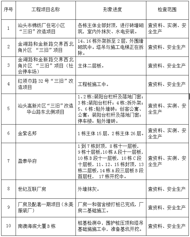 根據(jù)《汕頭市房屋建筑和市政基礎設施工程強攬工程、惡意競標涉黑涉惡問題專項整治工作方案》(汕住建[2018]87號)、《2018年度房屋和市政公用工程在建項目農(nóng)民工工資支付情況專項檢查工作方案》(汕住建[2018]77號)及《汕頭市住房和城鄉(xiāng)建設局開展房屋和市政公用工程建設領域反腐問題專項整治工作方案》(汕住建[2018]91號)的要求,我司定于2018年8月20日至2018年8月24日開展掃黑除惡、農(nóng)民工工資支付、反腐整治專項督導檢查活動。