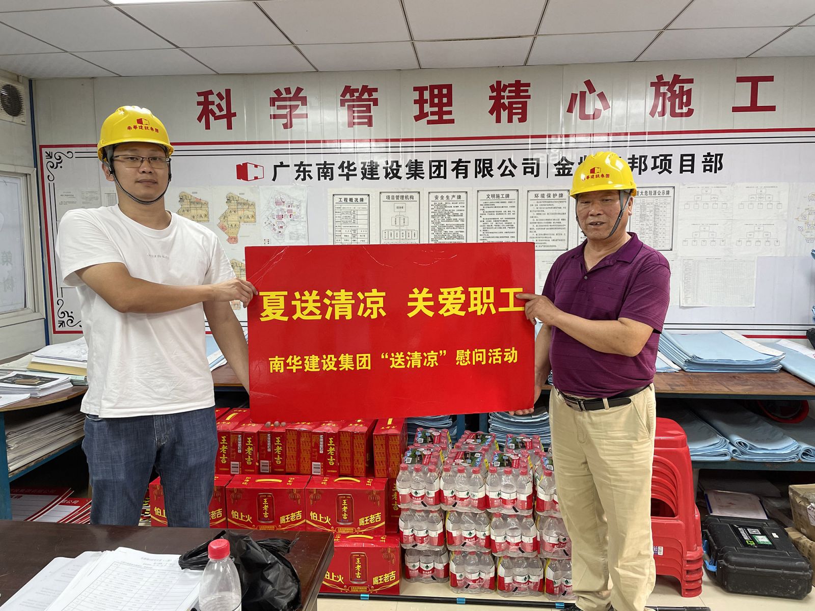 隨著氣溫不斷升高,在炎炎的酷暑下,驕陽(yáng)似火的夏日中,為保障現(xiàn)場(chǎng)操作工人身體健康,確保安全生產(chǎn),集團(tuán)公司堅(jiān)持以人為本理念,認(rèn)真把一線員工的防暑降溫工作做到實(shí)處,為讓奮戰(zhàn)在工地一線的施工作業(yè)人員過一個(gè)清涼的夏天,近日,集團(tuán)公司工會(huì)組織開展“建筑工地送清涼”活動(dòng),向在建工程項(xiàng)目的施工作業(yè)人員送上涼茶等防暑降溫物品,給在夏日里仍堅(jiān)守崗位的建設(shè)者送上絲絲涼意和關(guān)懷。