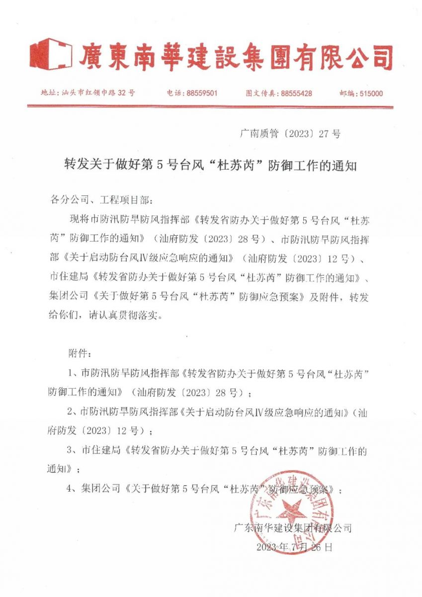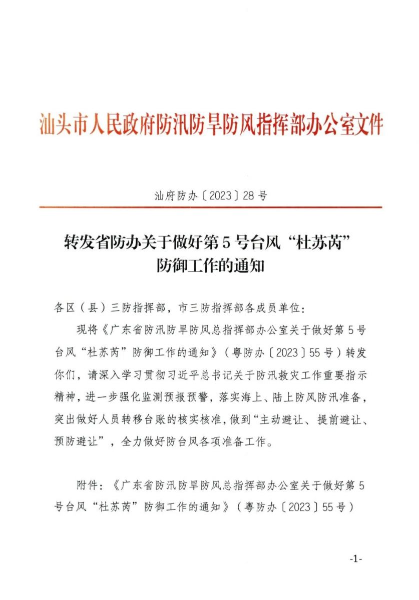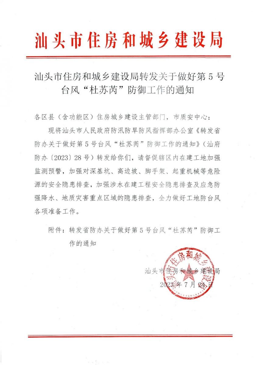 轉(zhuǎn)發(fā)關(guān)于做好第5號臺風(fēng)“杜蘇芮”防御工作的通知
