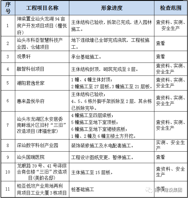 根據(jù)《汕頭市住房和城鄉(xiāng)建設(shè)局印發(fā)的關(guān)于全市城鄉(xiāng)住房建設(shè)領(lǐng)域重點(diǎn)行業(yè)安全生產(chǎn)大檢查的通知》、《關(guān)于做好國務(wù)院安委會2023年省級政府安全生產(chǎn)和消防工作考核巡查開展專項(xiàng)排查整治行動自查自改工作的通知》的要求、重大安全事故隱患專項(xiàng)排查整治,集團(tuán)公司本季度重點(diǎn)對在建項(xiàng)目建筑起重機(jī)械、高支模、深基坑、高處墜落、預(yù)防坍塌和施工消防安全等工程分別進(jìn)行了專項(xiàng)檢查,重點(diǎn)檢查以下專項(xiàng)工程的落實(shí)情況: