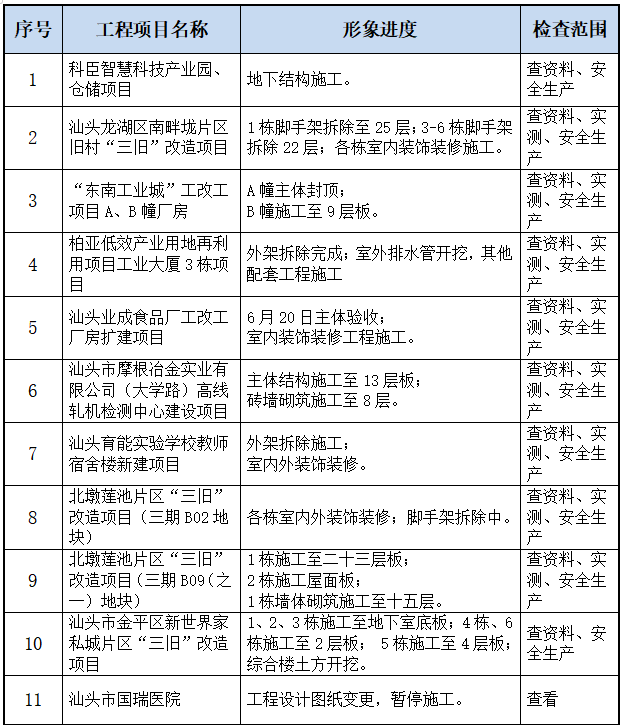 一、在建項目及其進(jìn)度 以下11個項目工程接受本次檢查。