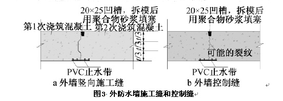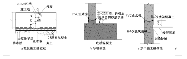總之,通過留凹槽和剪斷水平鋼筋形成薄弱截面,通過增加止水帶來加強(qiáng)防水。