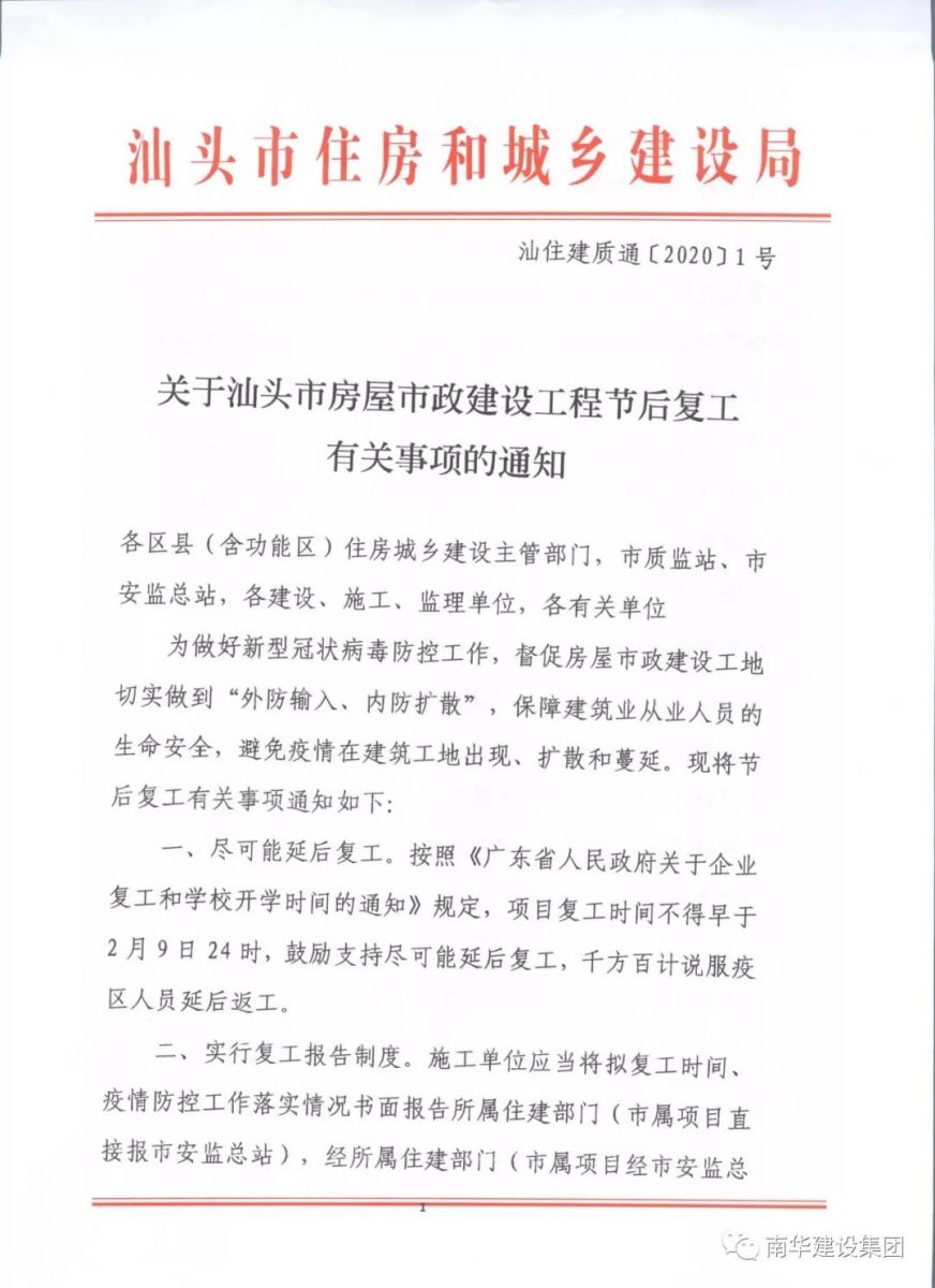 關(guān)于汕頭市房屋市政建設(shè)工程節(jié)后復(fù)工有關(guān)事項(xiàng)的通知