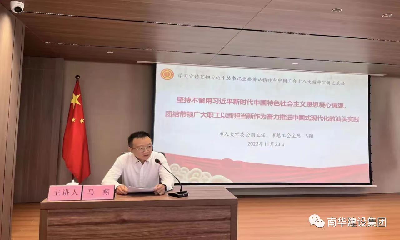 11月23日上午,由汕頭市總工會主辦、金平區(qū)總工會協(xié)辦的學(xué)習(xí)貫徹習(xí)近平總書記重要講話精神和中國工會十八大精神主題宣講活動在廣東南華建設(shè)集團(tuán)有限公司舉辦,市人大常委會副主任、市總工會主席馬翔出席活動并作專題宣講,市、區(qū)總工會有關(guān)領(lǐng)導(dǎo)同志及我市的中國工會十八大代表、工會干部和職工代表參加學(xué)習(xí)。南華建設(shè)集團(tuán)作為金平區(qū)產(chǎn)業(yè)工人隊(duì)伍建設(shè)試點(diǎn)企業(yè),在市、區(qū)總工會的指導(dǎo)下,公司密切結(jié)合企業(yè)實(shí)際,以黨建帶工建,工建促黨建,凝聚廣大職工力量,匯集廣大職工智慧,把企業(yè)建設(shè)成一個(gè)“和諧發(fā)展、廉潔高效”的堅(jiān)強(qiáng)團(tuán)隊(duì)。我們要認(rèn)真學(xué)習(xí)宣傳貫徹好習(xí)近平總書記重要講話精神和中國工會十八大精神,充分發(fā)揮工人階級主力軍作用,大力弘揚(yáng)勞模精神、勞動精神、工匠精神,以實(shí)際行動推動公司走好高質(zhì)量發(fā)展之路。